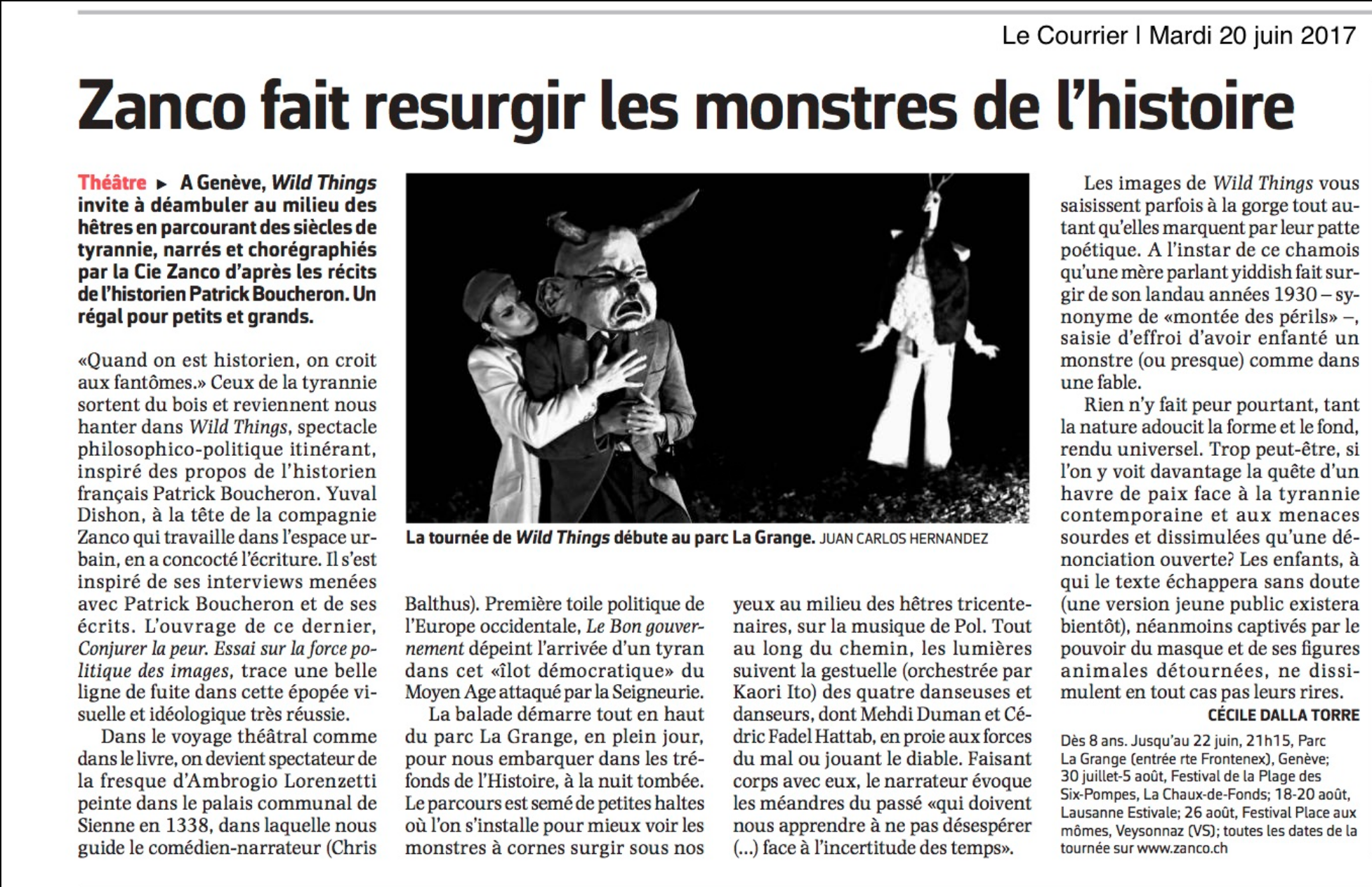 Le texte de "Wild Things" a été composé à partir d’interviews de l’historien médiéviste Patrick Boucheron. Il dessine une pensée en mouvement qui questionne le rôle de l’Histoire et le pouvoir des mots, dans une société inquiète de son avenir.